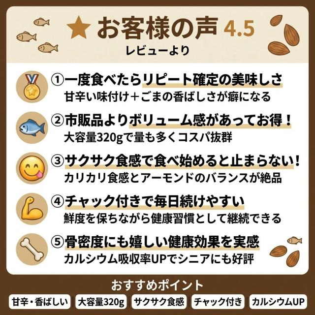 - 小魚サクサクでアーモンド量も多いので食べやすい。食べ初めると止まらない。