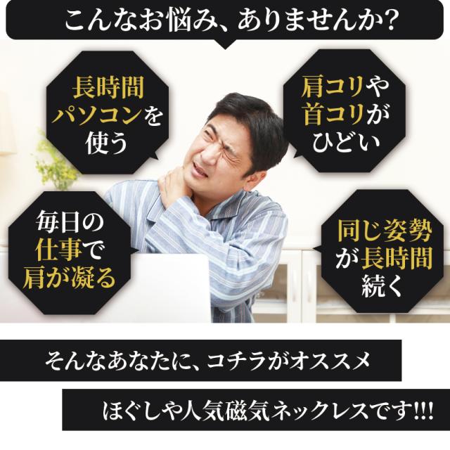- 1日中、パソコンを見てる仕事なので肩こりがひどいのですが、つけはじめてからはだいぶ肩の痛みが軽くなってるきがします。これからもずっと使い続けたいです。