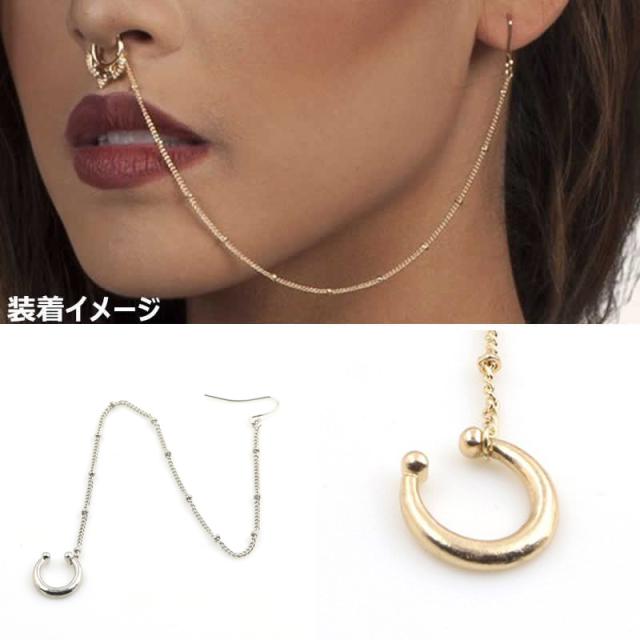 鼻ピアスのセプタムとピアスをチェーンでつなげた存在感のあるボディピアス。ハードテイスト満点のチェーン鼻ピアス。セプタムはノンホールピアスなので、鼻ピアスが開いていなくても装着できる。耳のピアスのフック部分はステンレスなので安心。メンズでもレディースでも使える鼻ピアス。プレゼントにもおすすめのボディピアスです。 (ご購入の際のご注意)