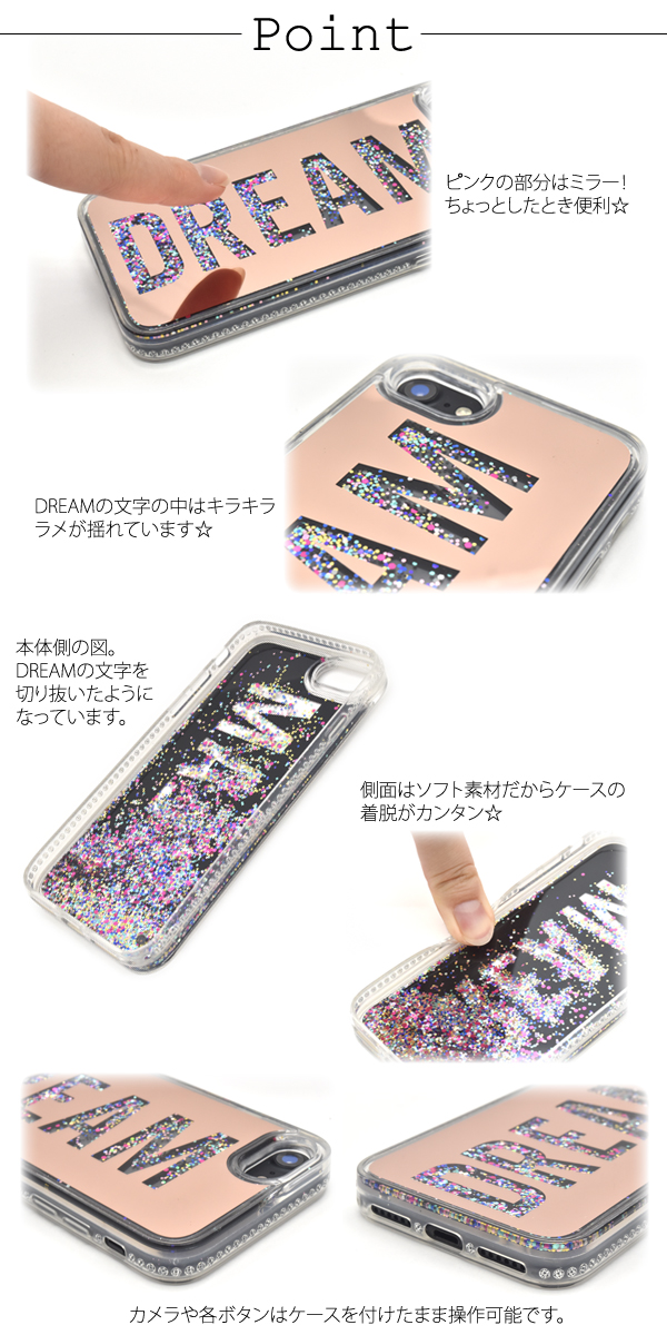 DREAMの中でラメがゆらゆら揺れるウォーターケース!ピンクの部分はミラーになっていてちょっとしたとき便利です☆衝撃やキズなどからiPhone7/8を守るのはもちろん、カメラ、イヤホンや各種ボタンなどをケースに入れたまま操作可能です。 側面はソフト素材なので着脱が簡単です。※iPhone7/8は付属しません。※ライセンス商品ではありません。※衝撃を与えると、中の液体が漏れ出す場合があります。取り扱いにはご注意ください。