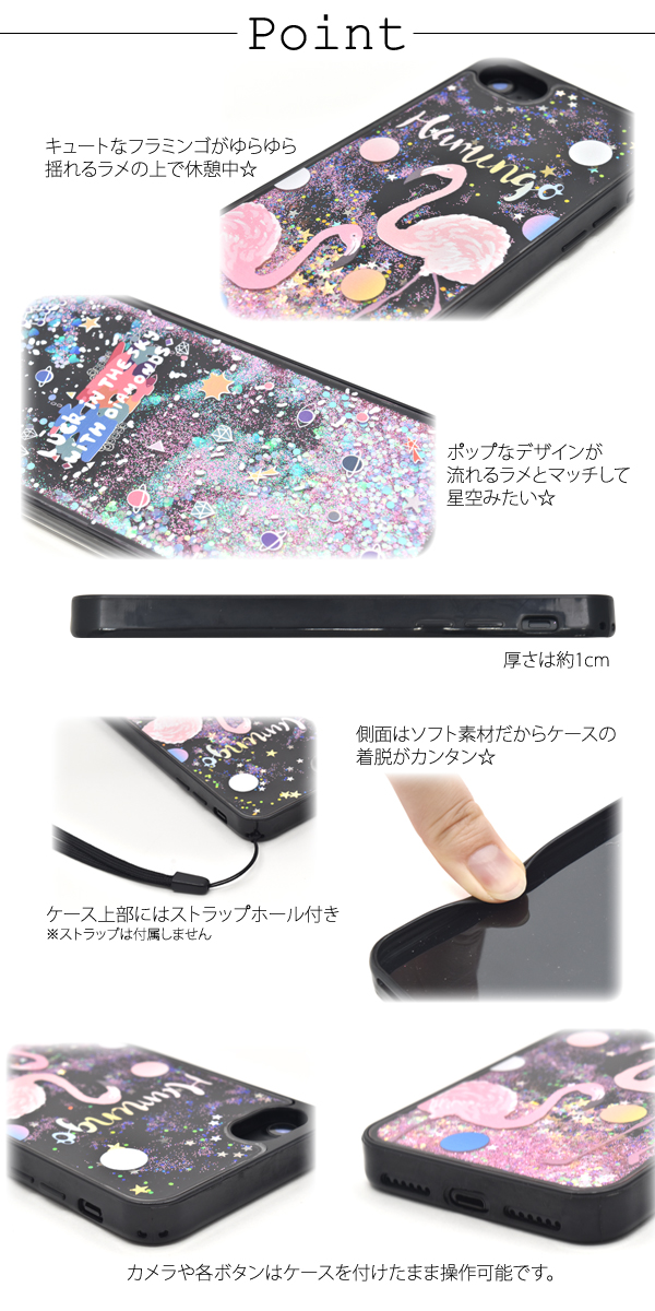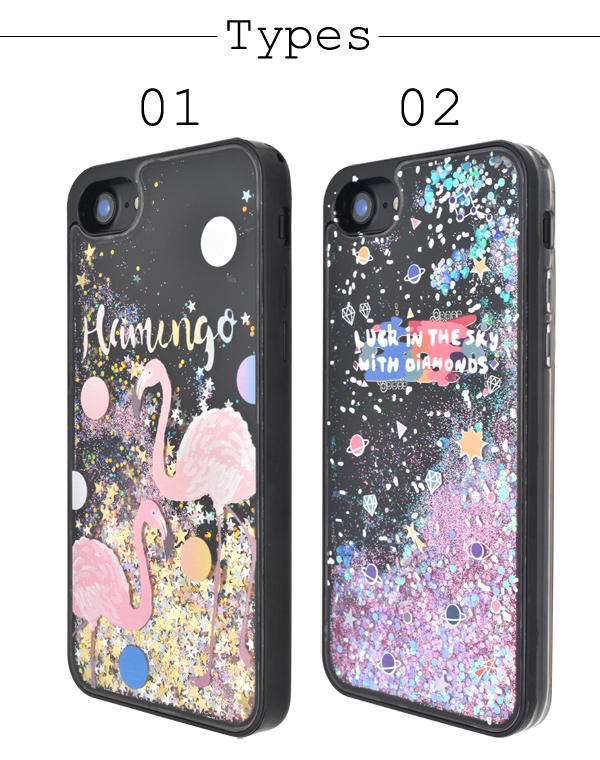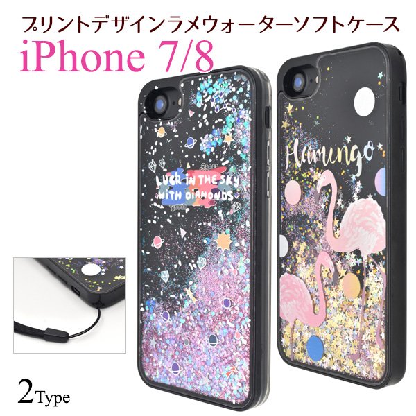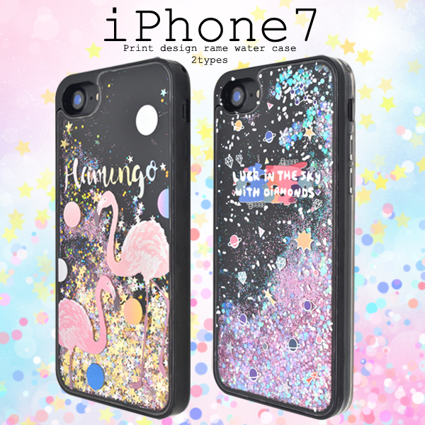 iPhone7 iPhone8 iPhoneSE(第二世代)用 プリントデザイン ラメウォーターケース 星 フラミンゴ ラメが流れる キラキラデコケース お洒落 SoftBank au docomo