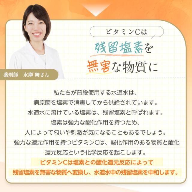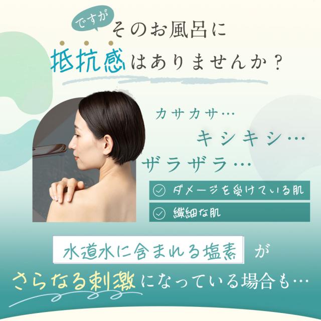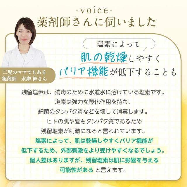 - 今まで気にしていなかったお風呂の塩素ですが、こちらの商品を使ってみて今までのお風呂との違いを実感して感動しました。これからの季節にはぴったりな商品だと思いました。使い続けて肌が変わってくれれば良いな。