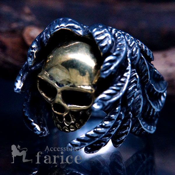 ゴールドスカル(金色の髑髏) リーフフェザー(葉の羽)オープンデザイン メンズ ステンレスリング