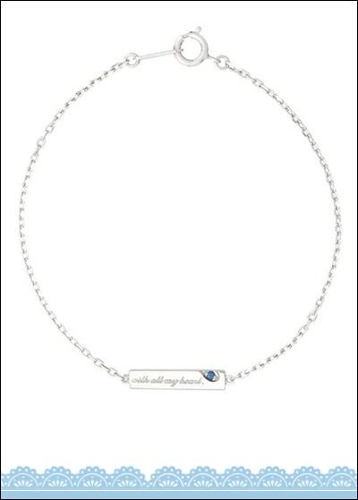 【カナル4℃】シンプルなバータイプのペアブレスレット。レディスと並べるとハートが浮かび、メッセージがつながります。レディスに「I love you deeply 」、メンズに「with all my heart.」と刻まれ、「あなたを心の底から深く愛しています。」という意味をこめています。誠実な愛を象徴するといわれるサファイアがきらめく、特別感溢れるデザインです。サイズ 幅0.1 トップ0.3×1.7 手首周り17.5素材シルバー、ロジウムコーティング、サファイア