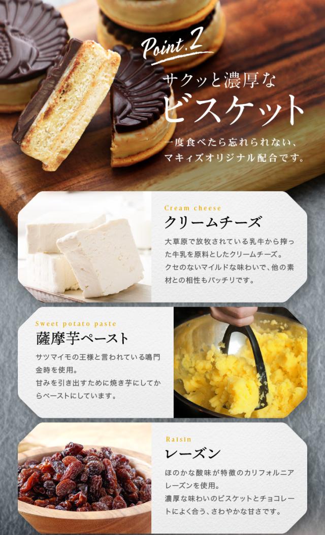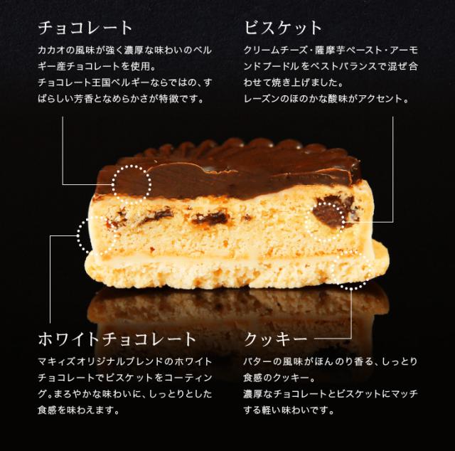 チョコレート(国内製造、外国製造)、砂糖、バター、小麦粉、卵、アーモンドパウダー、レーズン、さつまいも、マーガリン、洋酒、クリームチーズ、蜂蜜、粉末油脂、水飴、ココアバター、シナモン、食塩/乳化剤、香料、カゼインNa、カロテン色素、(一部に乳成分・小麦・卵・大豆・アーモンドを含む)