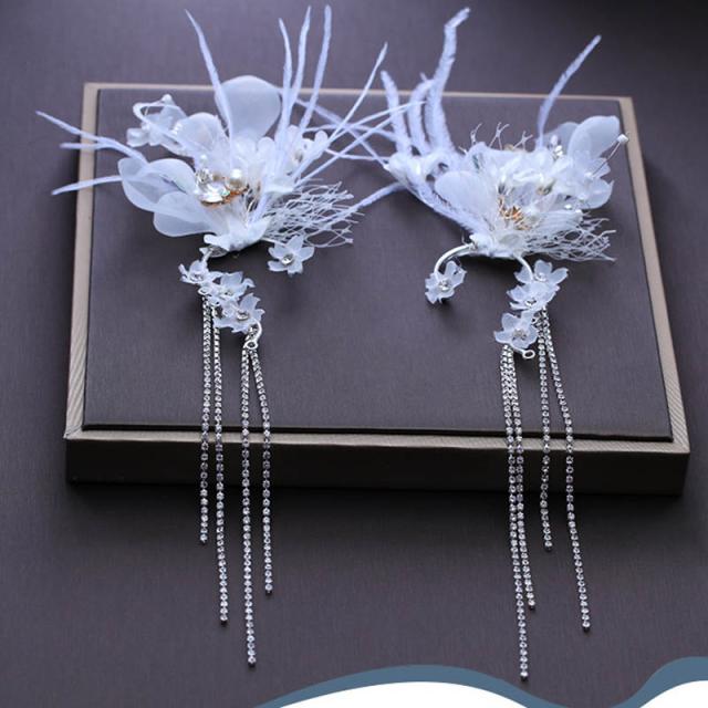 純白の白い花とイミテーションパールとクリスタルのジルコニアの長いチャームが揺れる