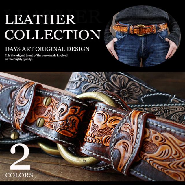 【最大P31%還元☆三太郎の日開催中】本革 ベルト リングバックルベルト レザーベルト 硬質レザー ムラ染め カービングベルト フラワーカービング アンティーク加工 ブラスバックル 真鍮バックル バックルベルト 牛革ベルト ゴールドバックル 【ギフト】 bt070