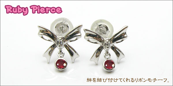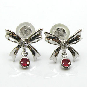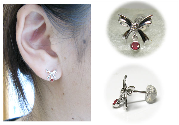 7月誕生石ルビーを二粒使用したリボンデザインの10金製ピアスです。