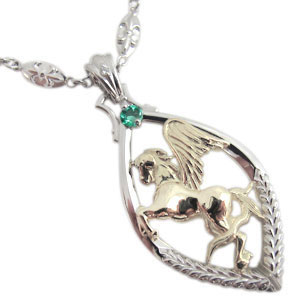 勇壮なペガサスに5月誕生石エメラルドを一粒使用した、シルバー&K10イエローゴールド製のホース(馬)デザインメンズネックレスコンビペンダントです。