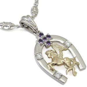 勇壮なペガサスに2月誕生石アメジストを使用した、プラチナ&K18イエローゴールド製のホース(馬)&馬蹄デザインメンズネックレスコンビペンダントです。