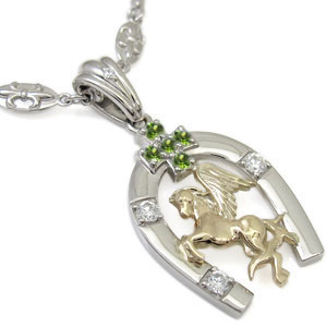 勇壮なペガサスに8月誕生石ペリドットを使用した、プラチナ&K18イエローゴールド製のホース(馬)&馬蹄デザインメンズネックレスコンビペンダントです。