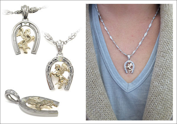 勇壮なペガサスに10月誕生石オパールを一粒使用した、プラチナ&K18イエローゴールド製のホース(馬)&馬蹄デザインメンズネックレスコンビペンダントです。