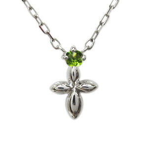 8月誕生石ペリドットを一粒使用した、18金製のクロス(十字架)モチーフプチネックレスです。