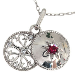7月誕生石ルビーを一粒使用した、 プラチナ製のスライドタイプのロケットペンダント・ネックレスです。 前面は誕生石を一粒使用したシンプルなデザインに、 スライドした中には、アンティーク調の唐草模様を施した透かしデザインにダイヤモンドが煌めきます。 ご自分へのご褒美や記念日、誕生日プレゼントなどの贈り物にもお勧めです。 | ||||||||||||||