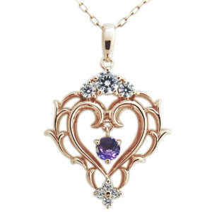 2月誕生石アメジストを使用した10金製の唐草(アラベスク)&ハートモチーフネックレスペンダントです。