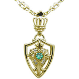 | 5月誕生石エメラルドを使用した18金製の、 クロス(十字架)&王冠(クラウン)デザインメンズ・ネックレスペンダントです。 オリジナルの百合の紋章モチーフチェーンを使用し、贅沢なネックレスに仕上げました。 | ||||||||||||||