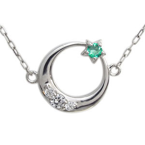 5月誕生石エメラルドを使用した、プラチナ製の三日月(ムーン)星(スター)モチーフネックレスペンダントです。