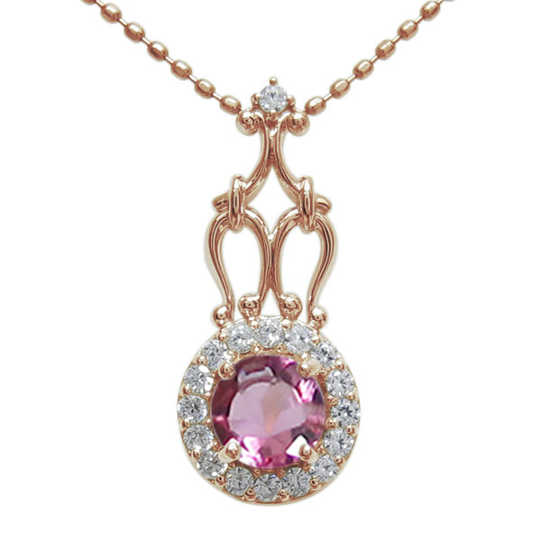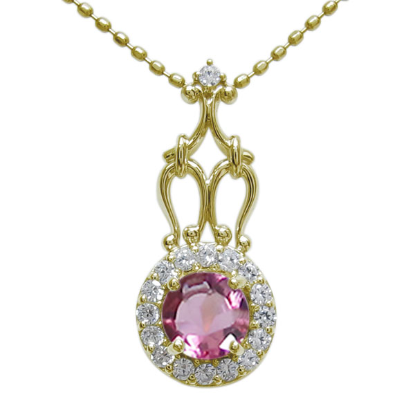 10月誕生石ピンクトルマリンを一粒使用した、18金製の取り巻きデザインのアンティーク調ネックレスです。