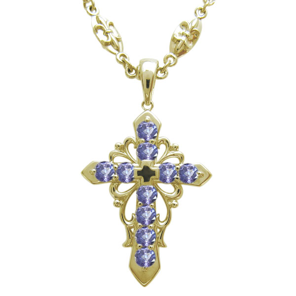 ![]() 12月誕生石タンザナイトを使用した、10金製の クロス&アラベスク(唐草)デザインメンズ・ネックレスペンダントです。 天然石10石を贅沢に使用したゴージャスなデザインが、大人の男性の魅力を引き出してくれます。 オリジナルの百合の紋章モチーフチェーンを使用し、贅沢なネックレスに仕上げました。
