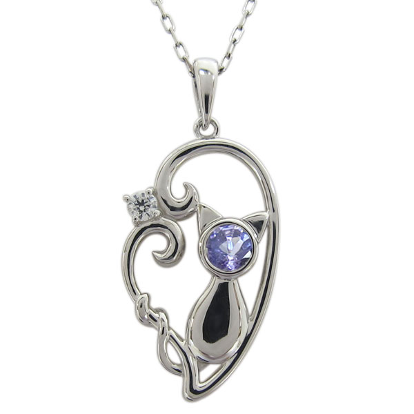 12月誕生石タンザナイトを使用したプラチナ製の猫(ネコ)&ハートモチーフネックレスペンダントです。