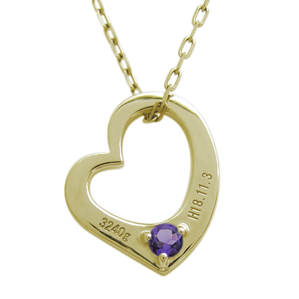 ![]() 2月誕生石アメジストを使用した、18金製のハートモチーフベビーリング(ネックレス)です。 ヨーロッパの古い伝統から生まれた”ベビーリング” 赤ちゃんが生まれた記念として贈られるメモリアルジュエリー 小さなリングに、元気に育って欲しいという愛が詰まっています ※刻印を 備考欄に5文字程度で3カ所ご記入ください。 記入例 【刻印表左(H18.11.3) 刻印表右(3240g)刻印裏(KOUKI)】