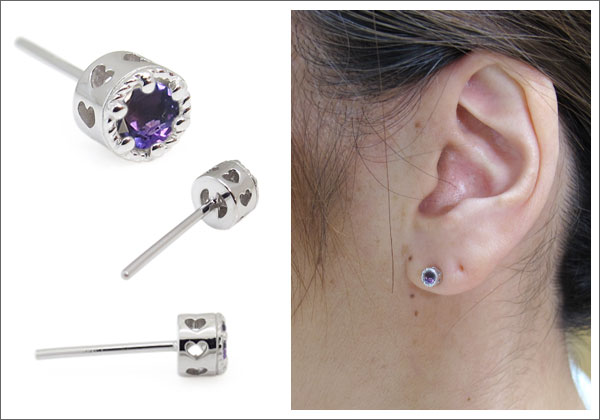 2月誕生石アメジストを一粒使用したハート&縄模様デザインの10金製シンプルピアスです。