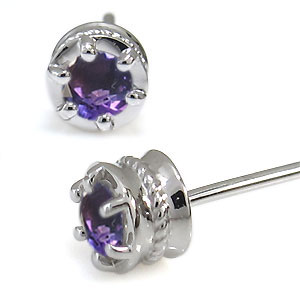 2月誕生石アメジストを一粒使用した縄模様デザインの10金製シンプルピアスです。