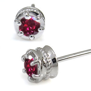 7月誕生石ルビーを一粒使用した縄デザインの18金製シンプルピアスです。