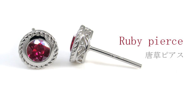 7月誕生石ルビーを一粒使用した唐草模様デザインの10金製シンプルピアスです。
