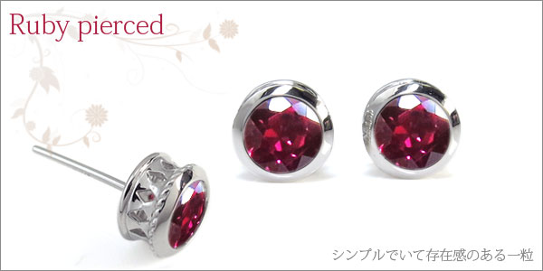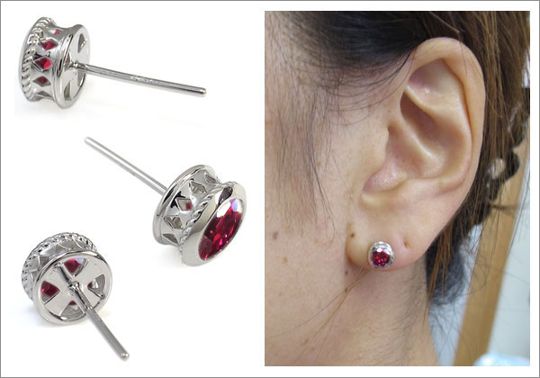 7月誕生石ルビーを一粒使用した縄デザインのプラチナ製ピアスです。裏面のクロスモチーフでさり気ないおしゃれを。