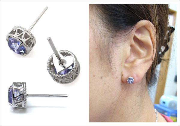 12月誕生石タンザナイトを一粒使用した唐草模様のプラチナ製ピアスです。