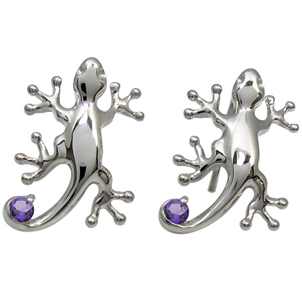 2月誕生石アメジストを一粒使用したプラチナ製の可愛いヤモリモチーフピアスです。