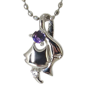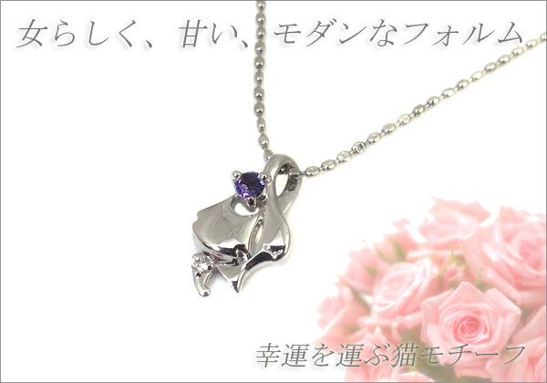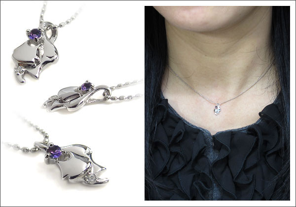 2月誕生石アメジストを一粒使用した18金製猫(ネコ)モチーフネックレスペンダントです。