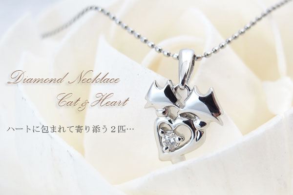 ダイヤモンド ネックレス 4月誕生石 10金 ネコ ハート ペンダント