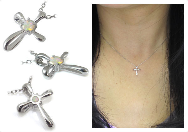 プラチナ・オパール・ネックレス・クロス・一粒・レディース