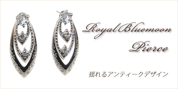 6月誕生石ロイヤルブルームーンストーンを一粒使用した18金製アンティークデザインのゆらゆら揺れるピアスです。