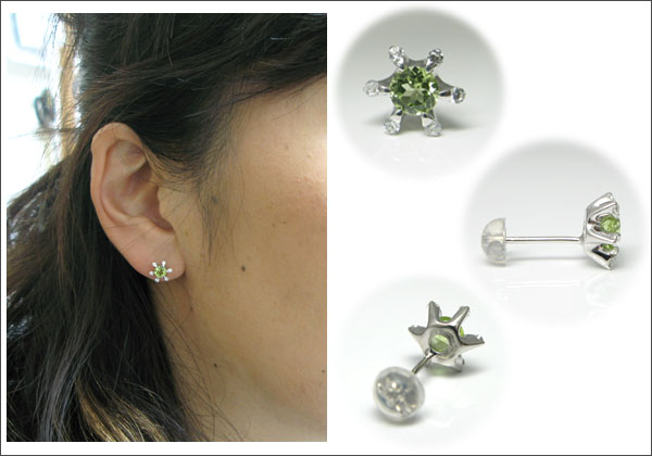 8月誕生石ペリドットを二粒使用した雪の結晶モチーフのプラチナ製ダイヤモンド付きピアスです。