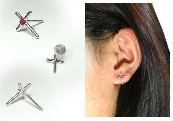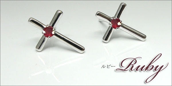 7月誕生石ルビーを2粒使用したクロスデザインの18金製ピアスです。