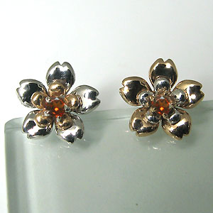 1月誕生石ガーネットを使用した10金製、3パーツ・フラワーモチーフピアスです。