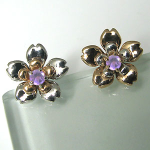 2月誕生石アメシストを使用した10金製、3パーツ・フラワーモチーフピアスです。