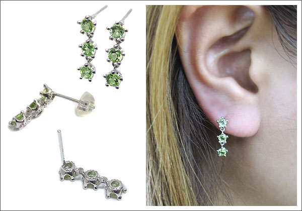 8月誕生石ペリドットを使用したゆらゆら揺れる王冠トリロジーデザインの10金製ピアスです。