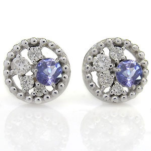 12月誕生石タンザナイトを一粒使用したミル打ちデザインの18金製ピアスです。