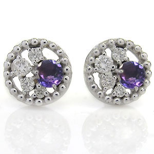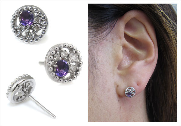 2月誕生石アメジストを一粒使用したミル打ちデザインの18金製ピアスです。