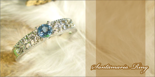 3月誕生石サンタマリアを一粒使ったアンティークデザインの18金リングです