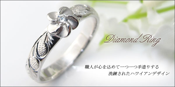 4月誕生石ダイヤモンドを一粒使用し、手彫り彫金を施した18金製ハワイアンジュエリーリングです。