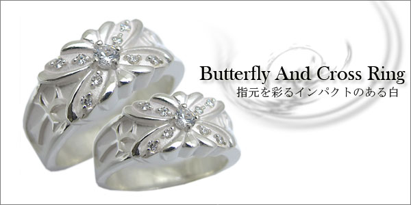キュービックジルコニアを一粒使用した、クロス&バタフライデザインのシルバー製リングです。
