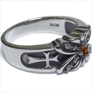1月誕生石ガーネットを一粒使用した、クロス&バタフライ(蝶)デザインのシルバー製メンズリング(指輪)です。