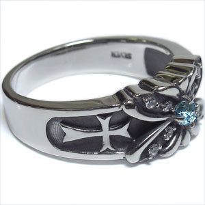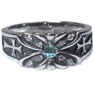 11月誕生石ブルートパーズを一粒使用した、クロス&バタフライ(蝶)デザインのシルバー製メンズリング(指輪)です。