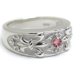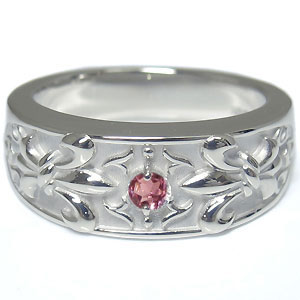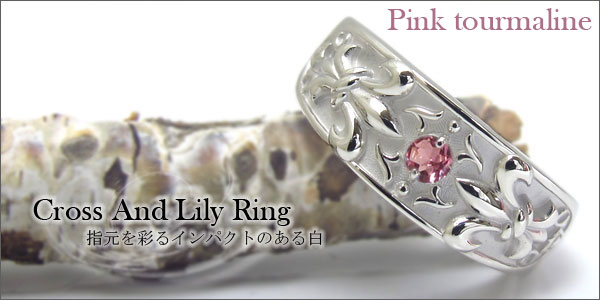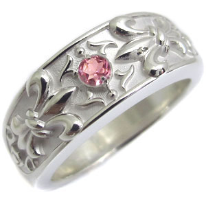 10月誕生石ピンクトルマリンを一粒使用したシルバー製、クロス&百合の紋章デザインのメンズリング(指輪)です。