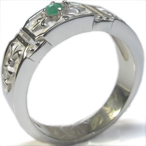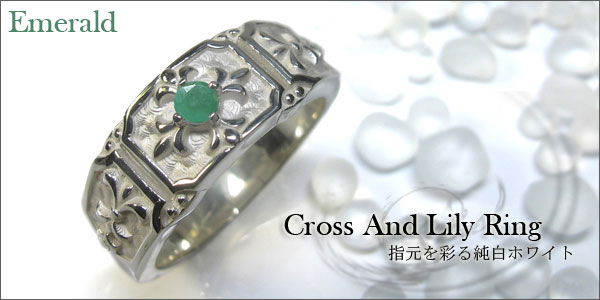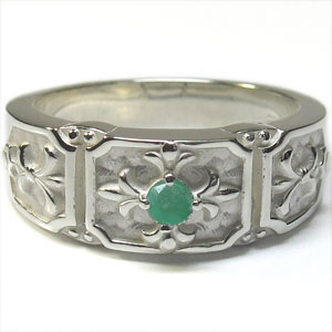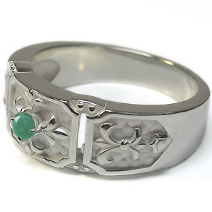 5月誕生石エメラルドを一粒使用した、クロス&百合の紋章デザインのシルバー製メンズリング(指輪)です。